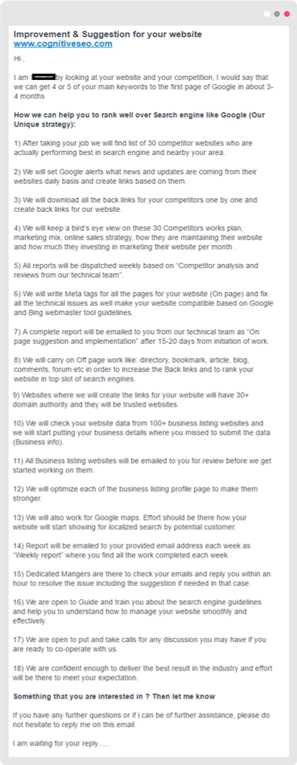 The remainder of the email reads like a badly-written proposal. It’s far, far too long. I’m not against someone pitching SEO services describing how they’re going to get results, but do it briefly. Save the detail for when you’ve already piqued someone’s interest.